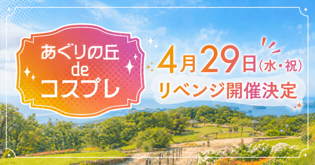 「あぐりの丘」でコスプレイベントを開催します。 屋外ロケならではの開放感たっぷりの写真を撮りながら、 作品を超えた交流も楽しめる1日です。