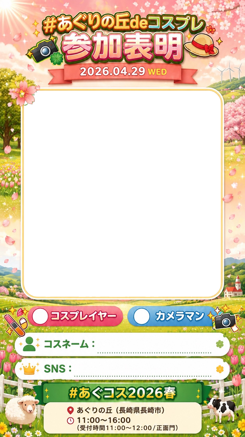 公式推奨ハッシュタグは #あぐコス2026春 です。