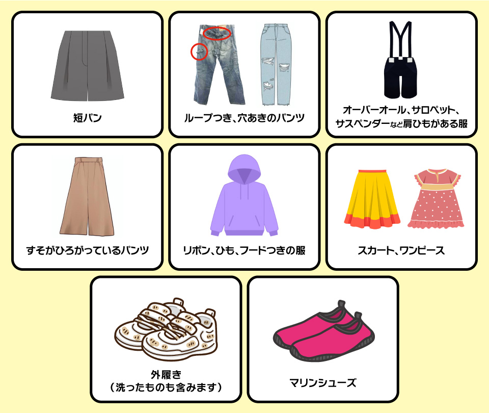 ケガ等の事故防止のため下記の衣服ではご利用いただけません。また、スタッフが危険と判断した場合もご利用いただけません。ご理解ご協力のほどよろしくお願いいたします。